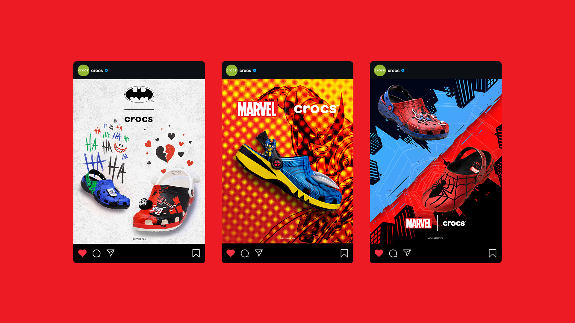 Crocs teamed up with Marvel and DC Comics to create a series of superhero themed Crocs. We were tasked to create a unique and dynamic series of campaigns for each new release that embodies the spirit of the superheroes portrayed. We targeted the campaign towards core fans of kids and adults showcasing their favorite superhero’s in an impactful way that aligns with Crocs brand.
